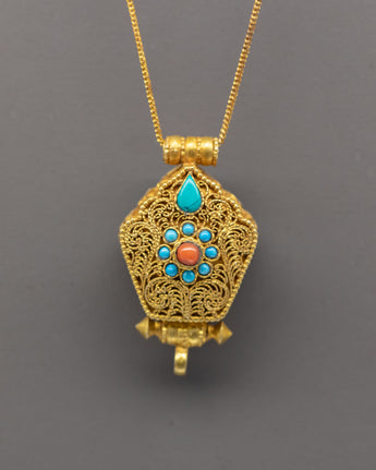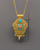 The Ghau Box Locket is a sacred Tibetan Buddhist prayer pendant traditionally used to carry mantras, relics, or protective blessings close to the heart. This finely crafted locket measures 5.5cm in height and 3cm in width, weighs 0.014kg, and feels lightweight, making it comfortable for daily spiritual wear. Made from silver with gold plating and accented with coral and turquoise artificial stones, this spiritual amulet represents devotion, protection, and a deep connection to Himalayan Buddhist traditions.