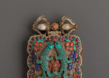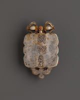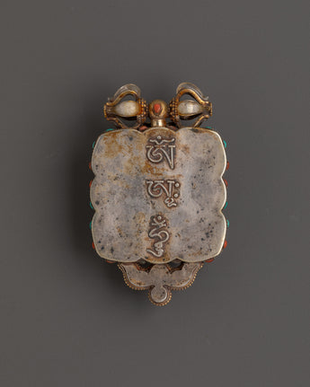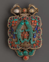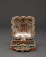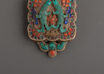 With its meticulous craftsmanship and profound symbolic value, this stunning handcrafted Tibetan Ghau Box is a precious spiritual item. This little treasure, which weighs 0.18 kg and measures 10 cm in height by 6.5 cm in width, is crafted from copper that has been silver-plated and embellished with original stones, including lapis lazuli, turquoise, and coral. The box's top has an exquisitely crafted Vajra sign, which stands for indestructibility and spiritual strength.