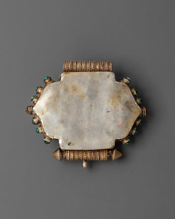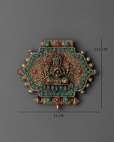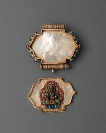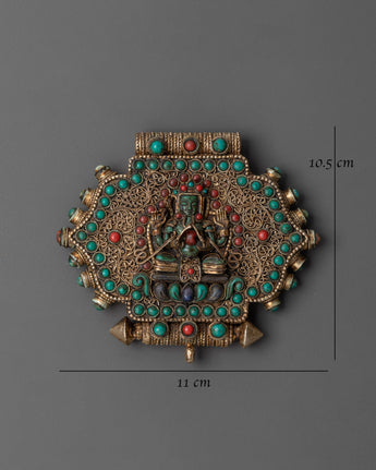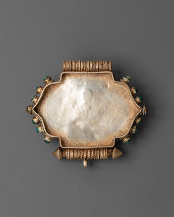 The front of the locket features an elegantly sculpted deity figure surrounded by fine filigree work and gemstone inlays, which represent compassion, protection, and divine energy. The other side unfolds to provide space for spiritual inserts, allowing practitioners to keep prayers and blessings near to their hearts. The colorful stones, coral for life, turquoise for healing, and lapis for wisdom, enhance its metaphorical potency.