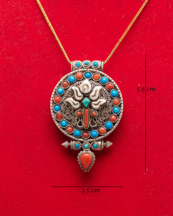 Inside the locket, the lotus flower stands as a reminder of the journey to inner peace and spiritual awakening. The turquoise stone is believed to promote serenity and positive energy, while the vibrant red coral offers strength and fortitude. Together, these elements create a powerful talisman for those seeking spiritual clarity and protection. The elegant design of the locket makes it a perfect companion for meditation, reflection, or as a meaningful gift for someone on their own spiritual journey.