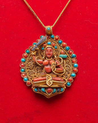 The Manjushri Ghau box pendant depicts Manjushri in his traditional form, wielding the sword of knowledge and the sutra (scripture), both of which represent the power of wisdom to cut through ignorance. The gold-plated silver body adds a polished touch, while the delicate designs on the Ghau box signify the sacred preservation of heavenly teachings. The use of coral and turquoise stones adds to the pendant's meaning—coral represents vitality and emotional protection, while turquoise is associated with healing and spiritual clarity.