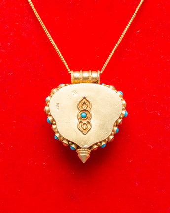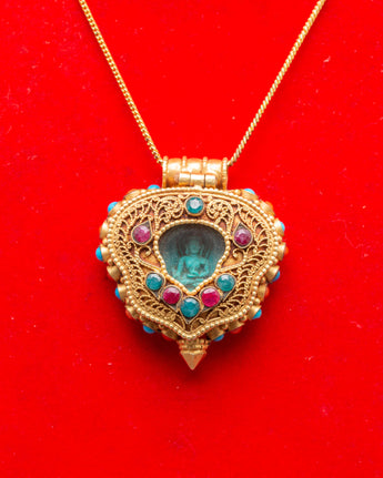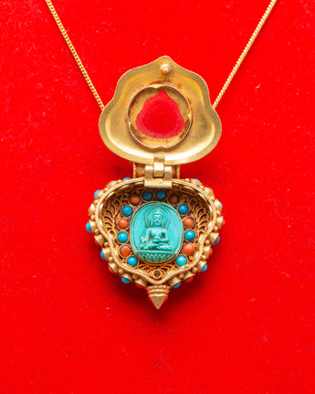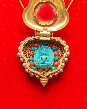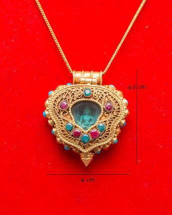 This Ghau amulet has an elaborate design, with a miniature, carved Medicine Buddha in the middle and a circle of turquoise and ruby stones around it. Turquoise is commonly utilized for healing and spiritual protection, whilst ruby is connected with vitality and strength. Panna stones, noted for their purity, round out the set of healing elements in the design. The gold-plated outer casing strengthens the spiritual connection to the sacred Medicine Buddha, transforming this locket into more than just a decorative item, but also a spiritual instrument for your well-being and awakening.