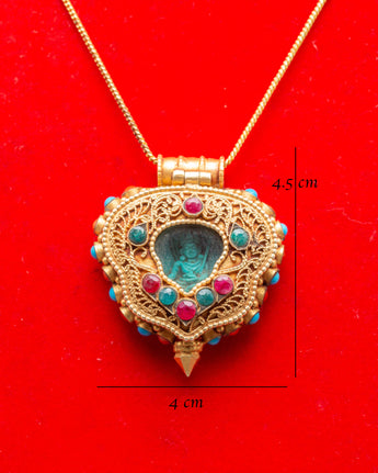 The Padmasambhava locket features a precise sculpture of Guru Rinpoche surrounded by a crown of ruby stones, renowned for their tremendous defensive properties, and turquoise, which is believed to promote spiritual healing. The panna stones provide clarity and knowledge, signifying Guru Rinpoche's celestial attributes. The gold plating enhances the rich design, giving the pendant an affluent yet spiritual appearance that reflects Padmasambhava's blessings and teachings. The combination of craftsmanship and symbolism makes it an ideal pendant for meditation, protection, and spiritual growth.