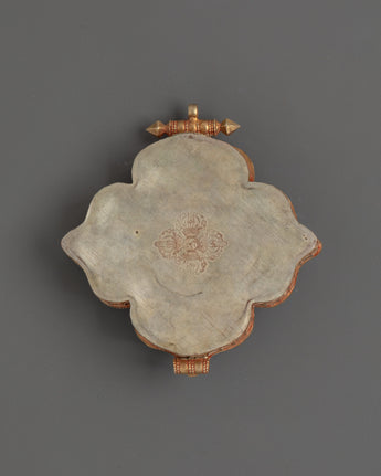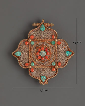 This Ghau box locket, measuring 14 cm in height and 13 cm in breadth, is an ideal blend of art and practicality. The copper structure and gorgeous gold plating are complemented by the vibrant turquoise and coral stones, which enhance the overall aesthetic appeal. Whether worn as spiritual jewelry or presented as a decorative object, this Tibetan Ghau Box Locket is a stunning addition to any collection. Embrace spiritual harmony with this one-of-a-kind, handcrafted pendant, perfect for meditation, giving, or personal reflection.