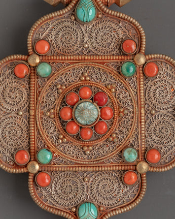 This stunning Spiritual Buddhist Filigree Ghau Box Locket is a perfect example of Tibetan craftsmanship and spiritual meaning. This sacred amulet pendant, handcrafted from a copper body and beautifully gold-plated, holds great significance in Buddhist tradition. The delicate filigree work gives a touch of elegance and traditional artistry, while the turquoise and coral stones embedded in the design represent protection and positive energy. This distinctive locket, which contains a star-shaped ghau box typically used to house sacred mantras or small relics, is ideal as a spiritual pendant or a treasured piece of Tibetan jewelry. It is a significant and influential item for people on a spiritual path. This item, which stands 14 cm tall and measures 13 cm wide, seamlessly blends beauty and functionality in a stunning design.