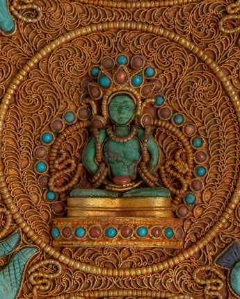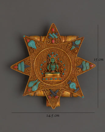 This Star-Shaped Ghau Box Locket is a stunning, handcrafted Tibetan spiritual pendant featuring delicate filigree work and rich copper and gold plating. Its height of 15cm and width of 14.5cm make it a remarkable item, perfect for those seeking distinctive and significant jewelry. This locket, made of turquoise and coral stones. The star-shaped design contributes to its visual appeal. At the same time, the engraved Tara Goddess inside the ghau box, together with distinctive symbols, adds a strong spiritual meaning, representing protection and enlightenment.