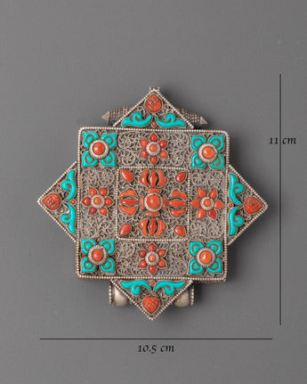 Handcrafted Tibetan Bishwo Vajra Ghau Box Locket | Silver Pendant with Coral & Turquoise Inlay