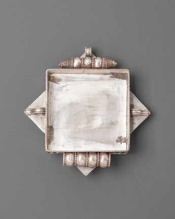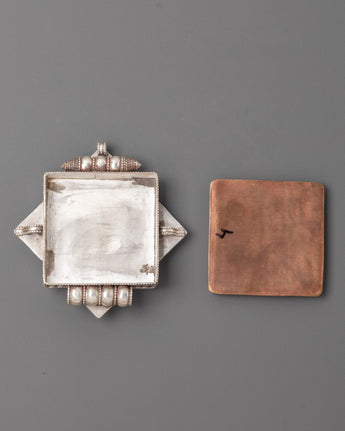 The Tibetan Bishwo Vajra Ghau Box Locket is a sacred and meaningful spiritual accessory, designed to enhance your meditation and prayer practices. Measuring 11cm in height and 10.5cm in width, this locket is meticulously crafted from silver and adorned with semi-precious coral and turquoise stones. The Bishwo Vajra, a symbol of indestructibility and spiritual power, is intricately carved on the surface, representing the unshakable strength of your spiritual journey. This locket is ideal for carrying sacred mantras, prayers, or protective items, making it a perfect companion for those seeking spiritual growth.