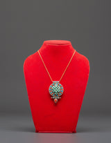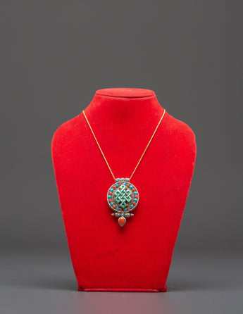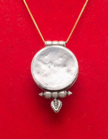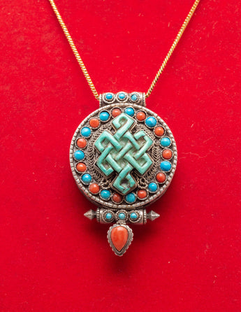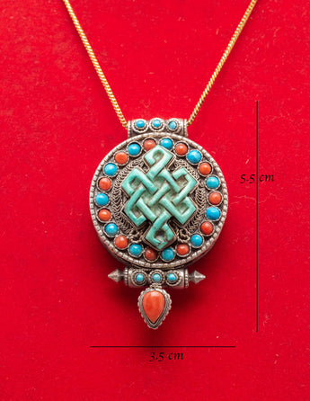 This Tibetan Ghau box pendant has an elaborate and significant design, with the box pattern representing wisdom, serenity, and heavenly teachings. Coral and turquoise stones, both revered for their spiritual properties, enhance the pendant's appeal. Coral represents vitality, protection, and emotional equilibrium, whereas turquoise is prized for its therapeutic properties and capacity to promote clarity and spiritual awareness. The use of silver emphasizes the design's purity and holiness, transforming it into more than just a piece of jewelry but a potent spiritual weapon.
