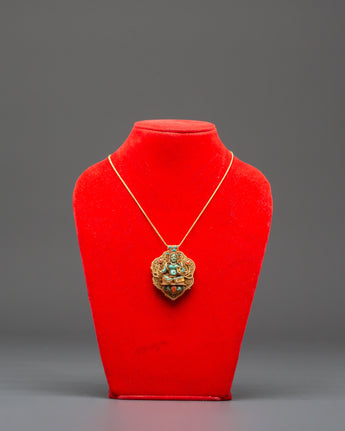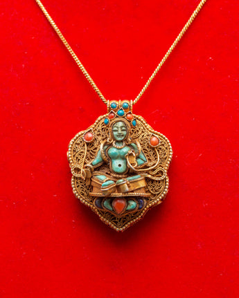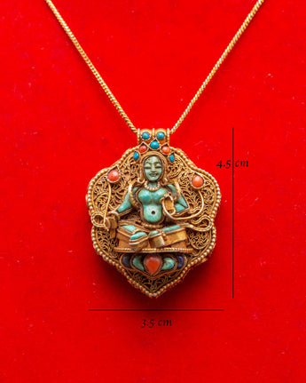 The Tibetan Green Tara Ghau Box Locket is a stunning piece of spiritual jewelry, skillfully crafted to depict the powerful Green Tara, a deity renowned for her compassion, protection, and healing. This locket, measuring 4.5cm in height and 3.5cm in width, and weighing 0.20kg, combines silver and gold plating to create an exquisite and significant charm. The elaborate design symbolizes Tibetan Buddhism's rich spiritual legacy, while the artificial turquoise and coral stones offer brilliant color and tremendous symbolic force. Turquoise is valued for its protective and healing properties, whereas coral is supposed to energize and revitalize the wearer. This locket serves as a talisman of tranquility, protection, and spiritual strength, in addition to being a piece of jewelry.