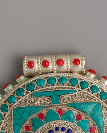 The Tibetan Treasure Box "Ghau" is a masterfully constructed piece that combines exquisite design with spiritual meaning. This box, which measures 13 cm in height and 10.5 cm in width, is composed of copper and has been electroplated with silver to add beauty. The intricate filigree work demonstrates the outstanding expertise of traditional Tibetan craftspeople, while the use of genuine turquoise, coral, and lapis lazuli stones provides brilliant color and symbolic importance. These stones are said to provide protection, healing, and spiritual energy, making the Ghau both a visual marvel and a valuable spiritual treasure.