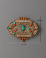This Buddhist Blessing Ghau Box Locket is a beautifully handcrafted Tibetan amulet designed to hold sacred prayers, mantras, and small spiritual items. Made with a copper body and silver-plated, it features a central teardrop turquoise stone that symbolizes protection and clarity. Surrounding it is finely detailed filigree metalwork that expresses the artistry and spiritual heritage of Himalayan craftsmanship. The arrangement of stones and patterns is harmonious, reflecting balance and inner peace.