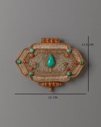 The surface of the locket is richly decorated with natural turquoise and coral stones that carry deep cultural meaning in Tibetan tradition. Turquoise is associated with spiritual grounding, while coral is linked to vitality and courage. Their placement across the piece highlights traditional motifs that echo blessings, compassion, and spiritual guardianship. These symbolic elements give the Ghau box a meaningful connection to Buddhist practice and protective energy.