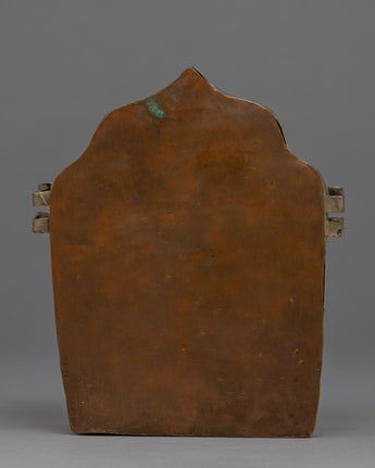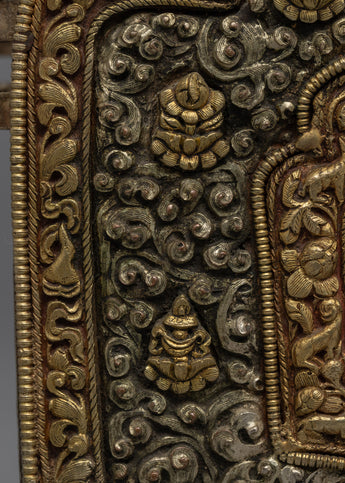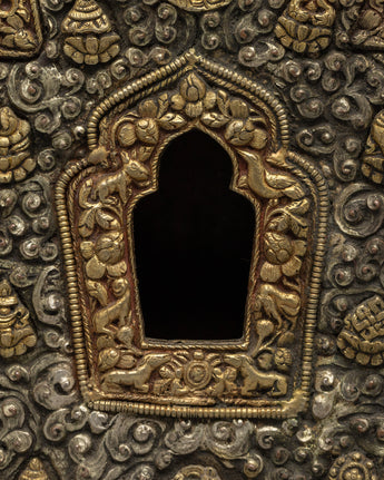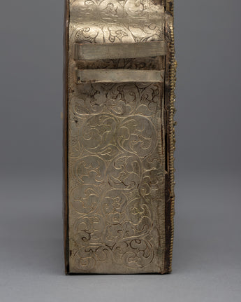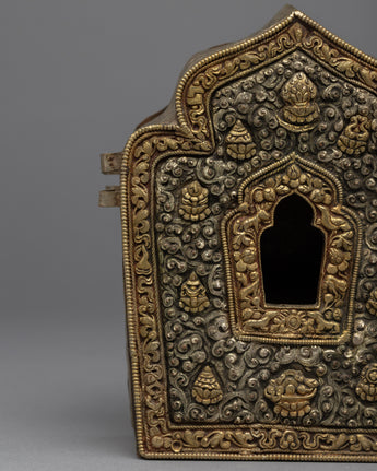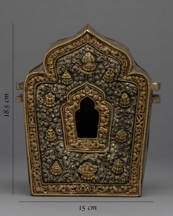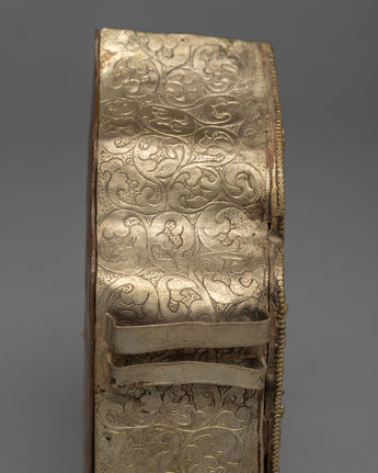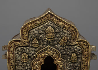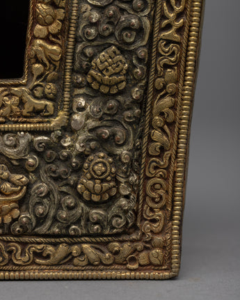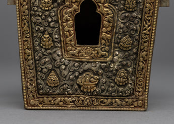 Our Ghau Prayer Box is beautifully carved with mystical Tibetan creatures and lucky symbols, such as Lotus Flowers, Tibetan Snow Lions, Clouds, and Conch Shells. It is made of copper with silver platings. It resembles a little container that may be used as a portable shrine or on your altar to keep and transport powerful, blessed objects.