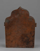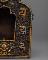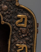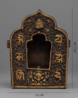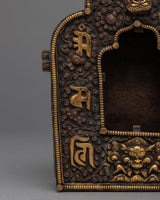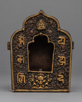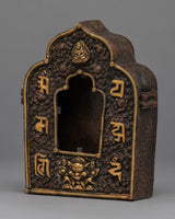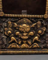 This Tibetan ghau is a copper body with 24k gold plated on the mantra crafted on it. It resembles a little container that may be used as a portable shrine or on your altar to keep and transport powerful, blessed objects.
