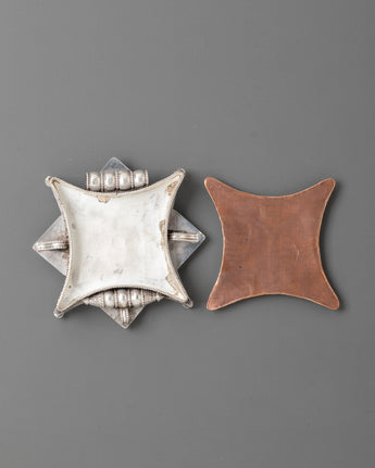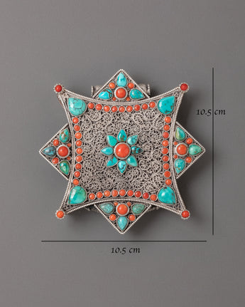 This Coral and Turquoise Pendant is a spiritually significant and beautifully crafted piece. Made of silver, a sacred locket that holds protective and healing energies. Adorned with semi-precious stones like coral and turquoise, this pendant not only adds an elegant touch but also embodies the power of these stones to promote vitality, peace, and spiritual balance.