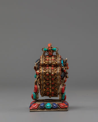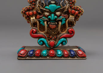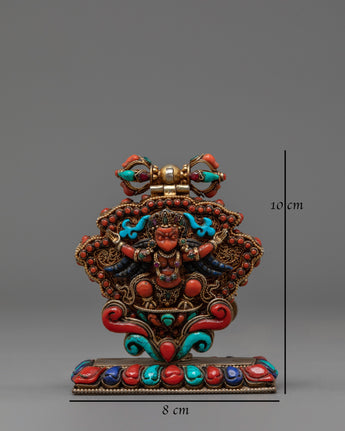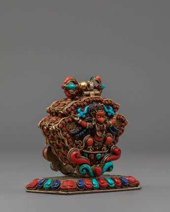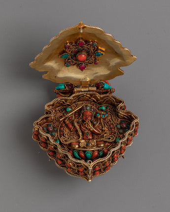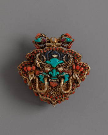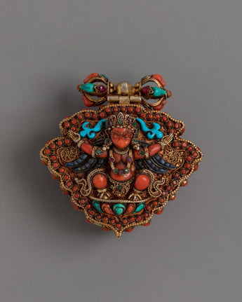 The Divine Bird Garuda Ghau Box is a majestic representation of protection and divine power in Tibetan Buddhism. This sacred amulet box is handcrafted from gold-plated copper and embellished with colorful coral, turquoise, and lapis lazuli stones. It depicts the majestic Garuda, the celestial bird deity known for overcoming hostile forces and symbolizing freedom and spiritual strength. Its elaborate design exemplifies both artistic mastery and profound spiritual connotation, making it an ideal piece for meditation rooms or personal altars.