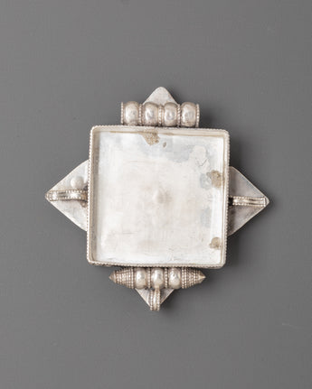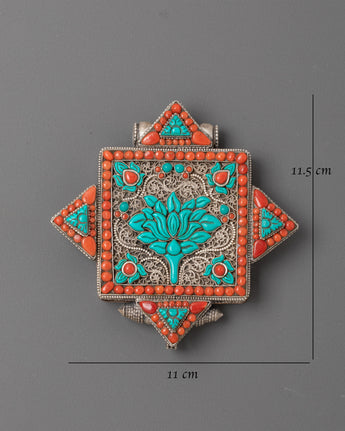 This Ghau Box with Semi-Precious Stones is a beautifully crafted silver Locket, adorned with vibrant coral and turquoise stones. Measuring 11.5cm in height and 11cm in width, it serves as an elegant and sacred Locket for spiritual, jewelry, or style.
