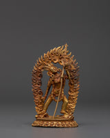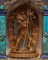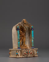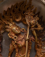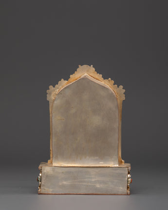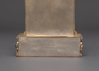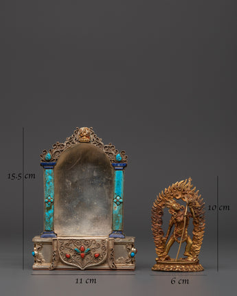 The Ghau Box with Vajrayogini is an exquisitely crafted Tibetan Buddhist item that combines spiritual significance with meticulous craftsmanship. Standing 15.5 cm tall and 11 cm wide, this magnificent box is intended to keep cherished belongings or serve as a sacred container for prayers. The center Vajrayogini Statue, which stands 10 cm tall and 6 cm wide, is composed of copper and exquisitely decorated with gold plating to capture the deity's heavenly spirit.