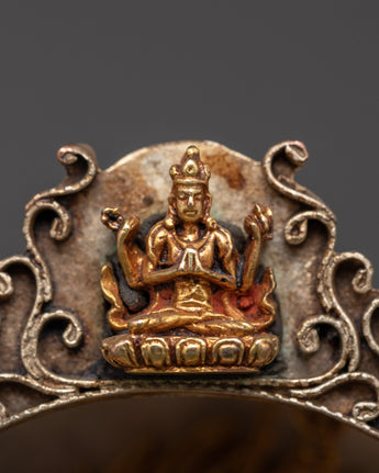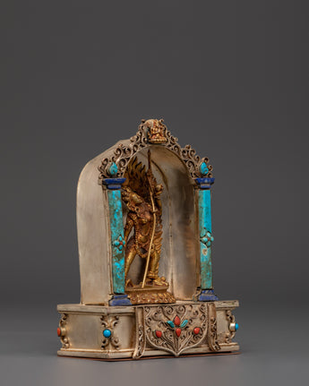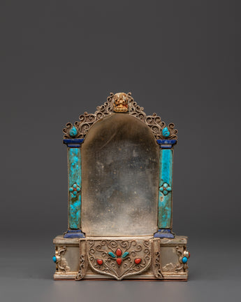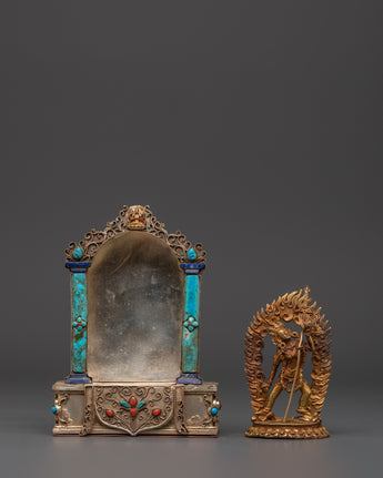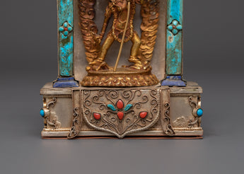 Vajrayogini is a renowned Tibetan Buddhist goddess who embodies transformation and enlightenment through the power of knowledge and compassion. This Ghau Box features turquoise and coral inlays, adding color and vitality to the design. The delicate silver- and gold-plated decorations make this a stunning complement to any Buddhist shrine or altar. Whether as a spiritual gift or for your collection, this precious object represents change and heavenly protection.