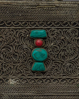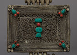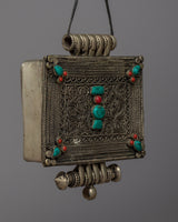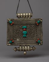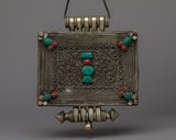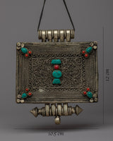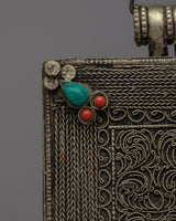 Behold our exquisite Ghau Pendant, meticulously handcrafted on a copper base and adorned with lustrous silver plating. This stunning piece of jewelry features a captivating floral design, carefully embedded with sparkling gemstones. The Ghau Pendant serves as a sacred container, traditionally used to hold sacred relics or prayers close to the heart. Its intricate craftsmanship and attention to detail make it a true work of art, evoking a sense of spirituality and beauty. Wear this pendant with pride, as it embodies the perfect harmony of craftsmanship and devotion, adding a touch of elegance and reverence to your attire.