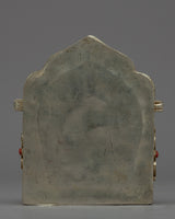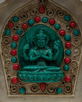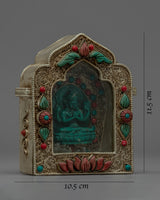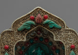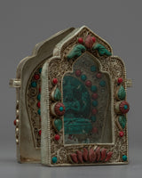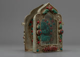 The Ghau Prayer Box is a traditional Tibetan and Nepali amulet box used to store and transport holy artifacts such as sacred relics, mantras, and miniature deity images. This Ghau Prayer Box is constructed on a copper body with silver plating and features a gorgeous deity carved inside. The jewels are also embedded in the box, which adds to its visual appeal.