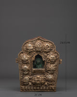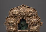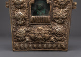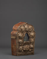 This Handcrafted Amulet Ghau Box is a ceremonial Tibetan Buddhist shrine made of copper that was initially used to house precious relics, mantras, or representations of protective deities. It is 24.5 cm tall and 21 cm broad, with a deity figure framed in rich gold that exudes spiritual energy. This Ghau is not just a devotional vessel, but it also serves as an essential object for rituals, meditation, and altar offerings.