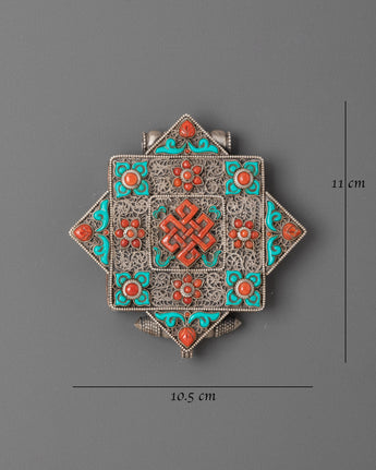 This Handcrafted Buddhist Amulet Ghau Locket is a beautiful piece of Tibetan jewelry that carries both artistry and spiritual meaning. Crafted from silver and set with semi-precious stones like coral and turquoise, this pendant is designed in the traditional style of a Tibetan prayer box. At its center lies the Endless Knot (Shrivatsa), a sacred Buddhist symbol representing infinite wisdom, compassion, and harmony.