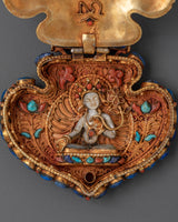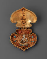 The locket contains a peaceful portrayal of a meditating divine, which adds to its spiritual strength. The deity's calm expression and graceful position symbolize peace, equilibrium, and the desire for enlightenment. This handcrafted Tibetan Ghau Locket is both a gorgeous adornment and a meaningful amulet, connecting you to Tibet's rich traditions and spiritual practices.