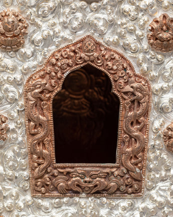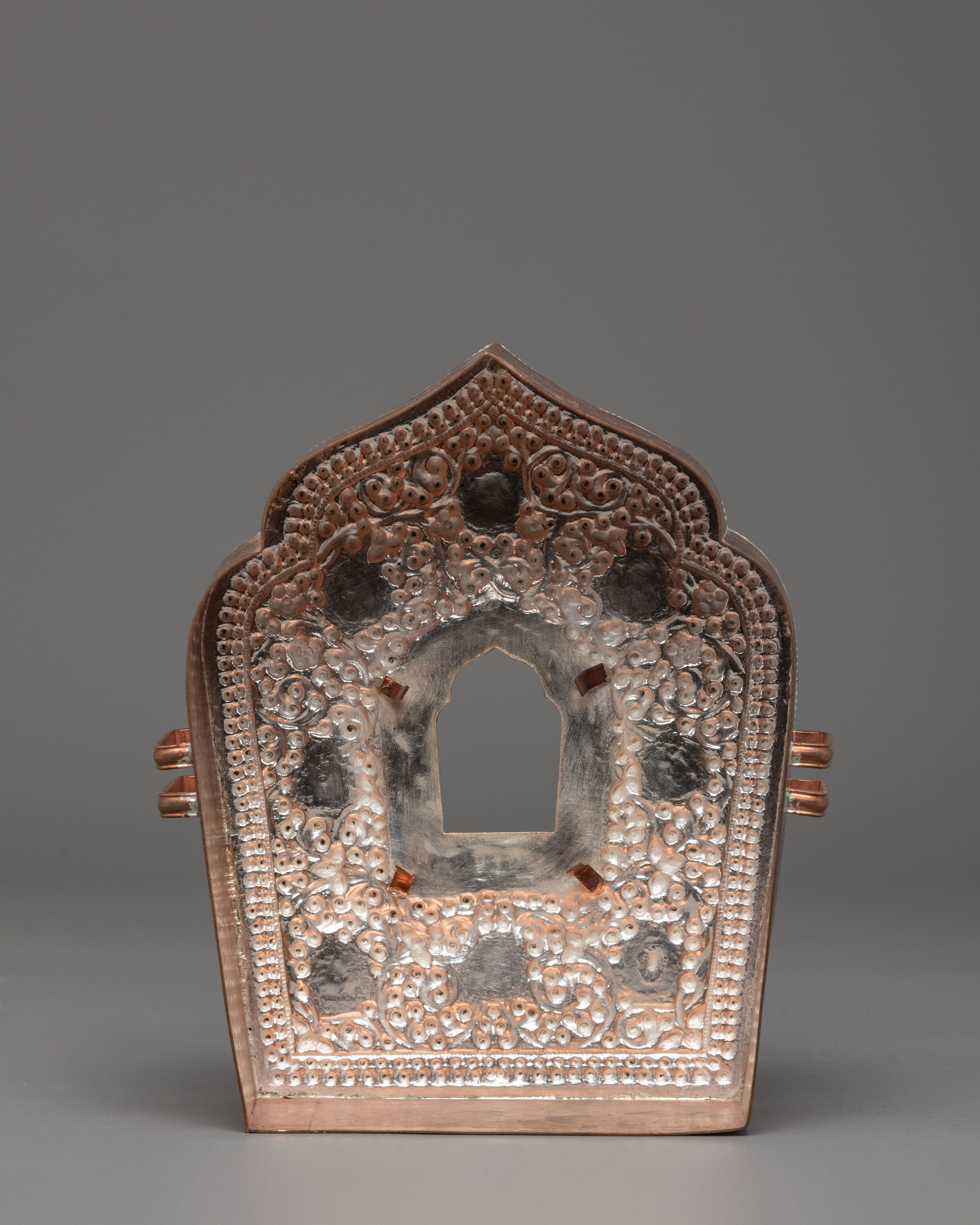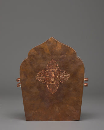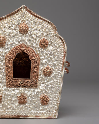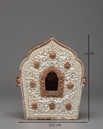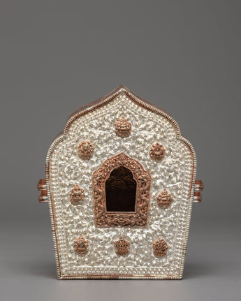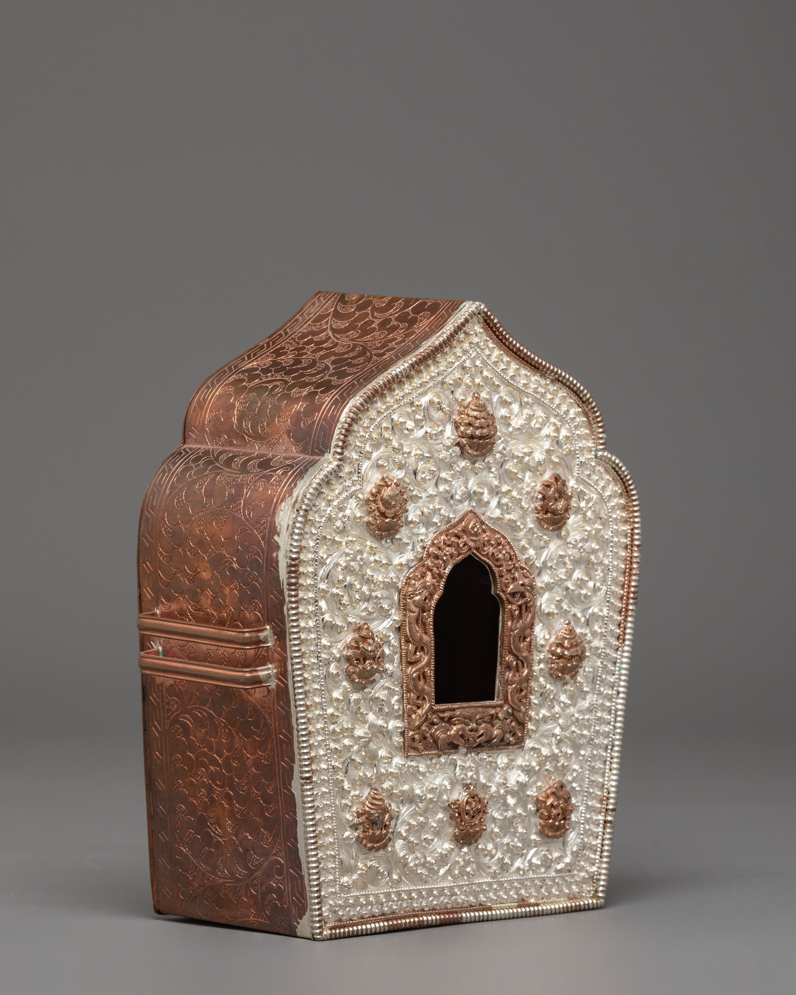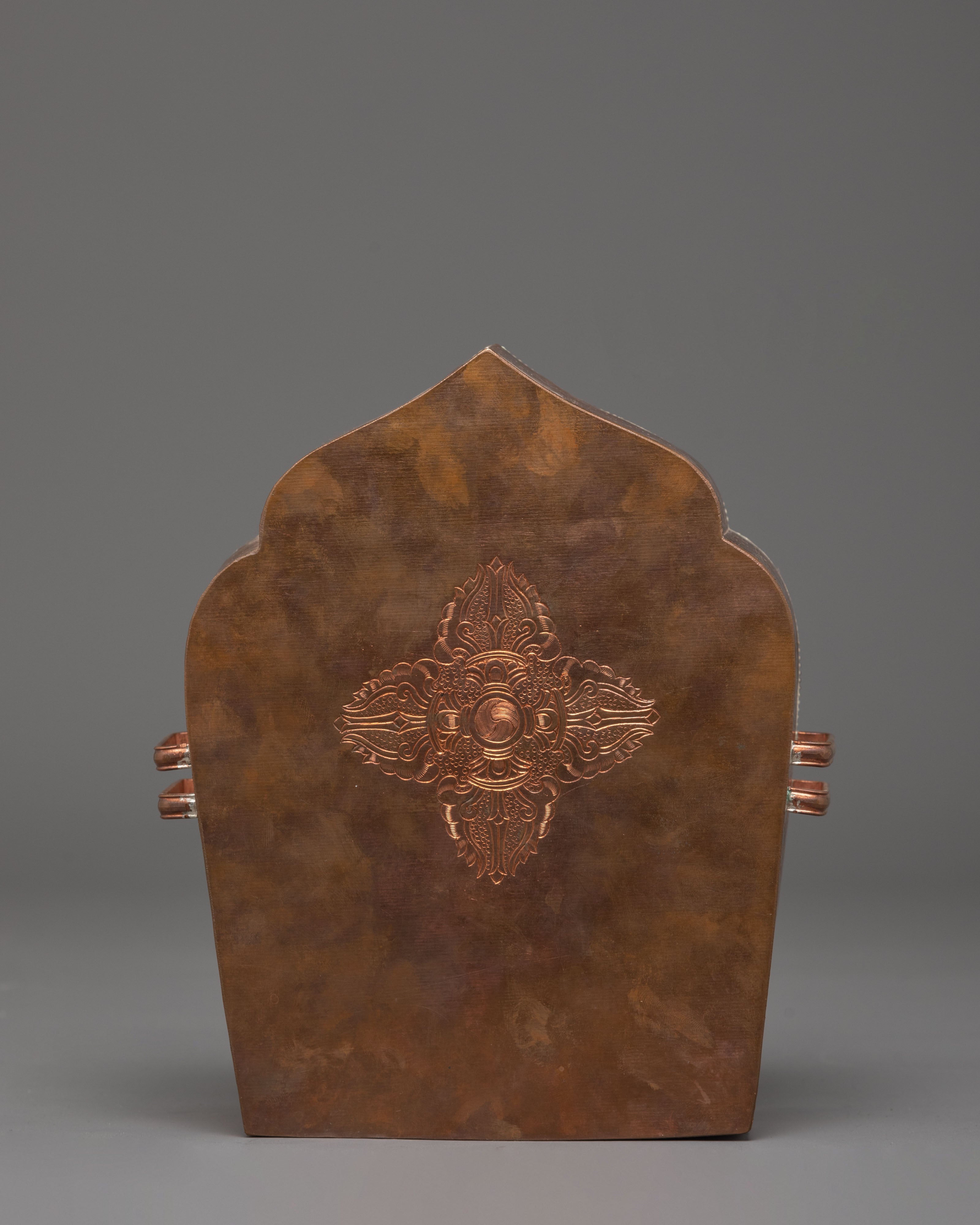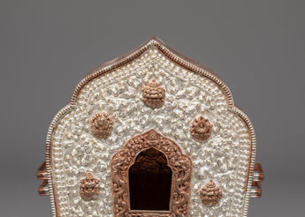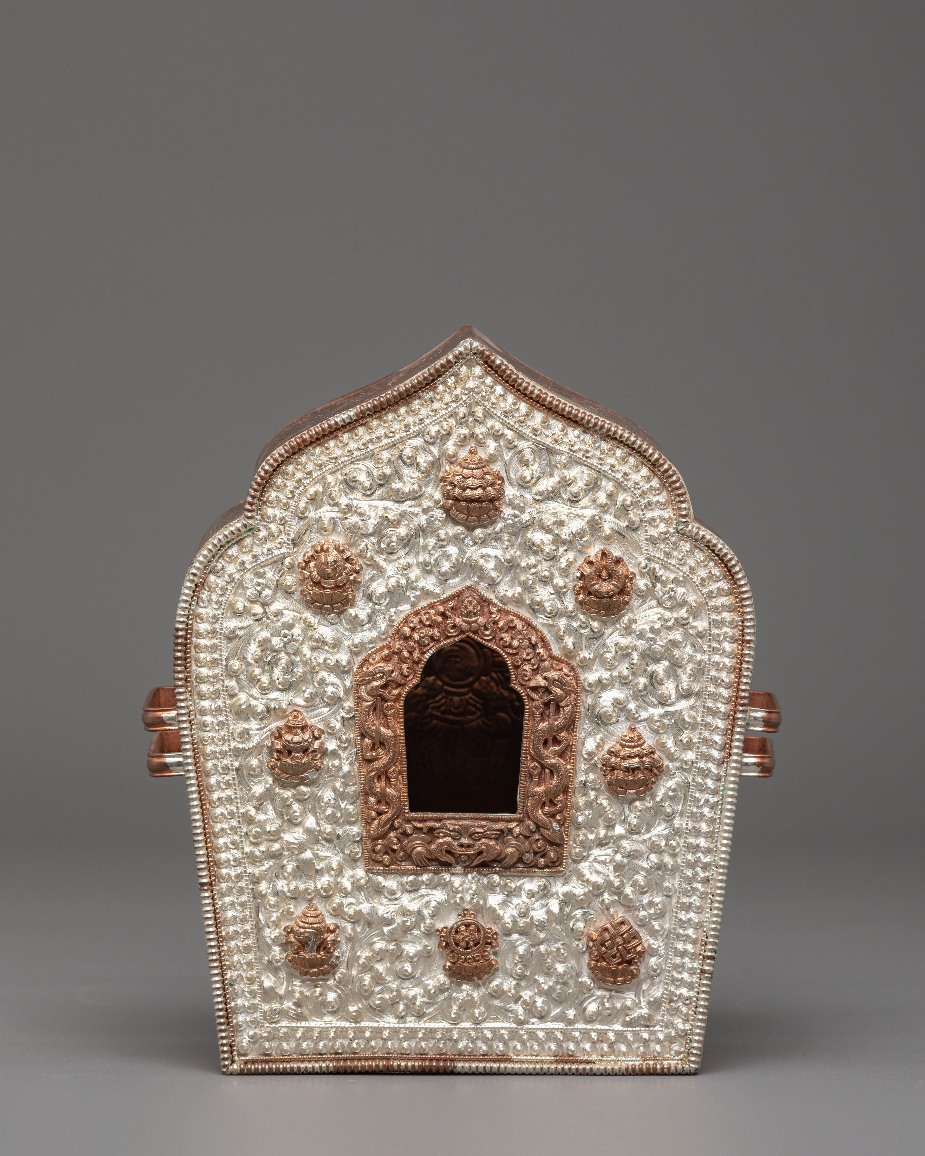 The Ghau Box is a beautifully handcrafted spiritual artifact designed to hold and protect sacred relics or treasures. Measuring 21cm in height and 18.5cm in width, this copper and silver Ghau Box weighs 0.92kg, making it the perfect size for display on your altar or meditation space. This box is not only a functional item but a work of art that enhances the energy of any room, offering a unique blend of craftsmanship and spiritual symbolism.