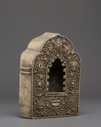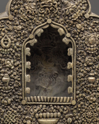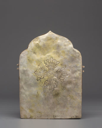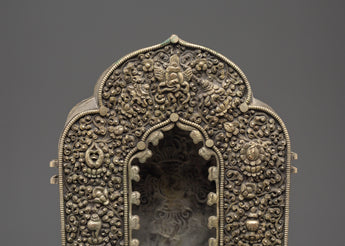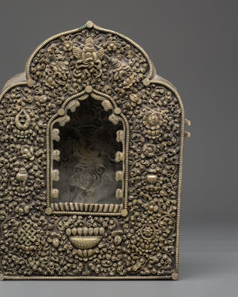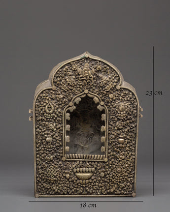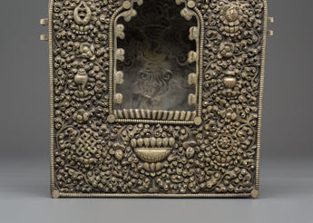 This Handmade Silver Plated Ghau Box is a precious and precisely created Tibetan Buddhist artifact suitable for storing prayer mantras, sacred artifacts, or relics. This prayer box, 22cm tall and 18cm wide, is wonderfully embellished with delicate silver-plated motifs, making it an incredible addition to any altar or meditation room. The copper body serves as a sturdy base, while the silver plating adds an exquisite finish to the box, boosting its spiritual value.