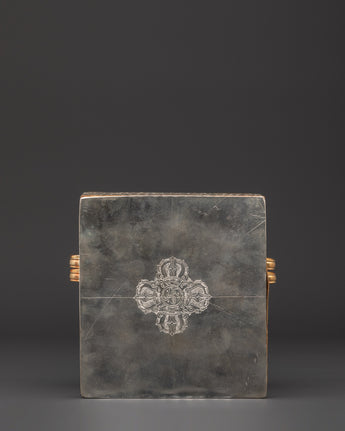 Crafted by expert artisans from copper, the box is gold-plated on the front and silver-plated on the back, with traditional work and engravings. Floral and symbolic motifs frame the central area, while the rear features the revered double vajra, which symbolizes spiritual stability and energy. This item, weighing 1.064 kg and measuring 16 cm in width, showcases the meticulous metalwork and skilled craftsmanship characteristic of Himalayan culture.
