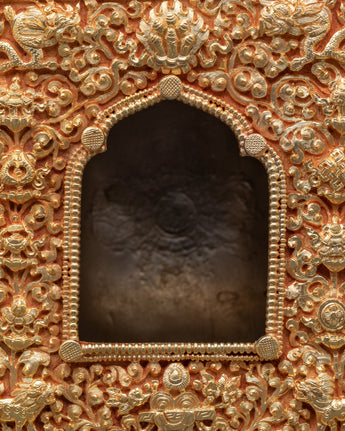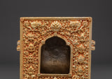 This Himalayan Ghau Amulet Box is a precious Tibetan Buddhist container that holds mantras, relics, and images of protecting deities. Ghau boxes, which are traditionally worn or displayed on altars, serve as spiritual foundations, benefiting and guiding those who carry or honor them. With its elaborate design and profound symbolic value, this artwork is an excellent addition to any personal shrine or sacred space.