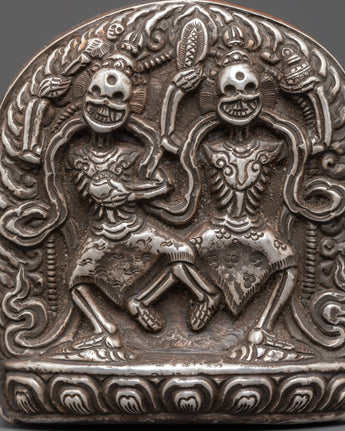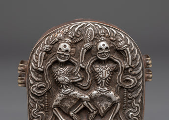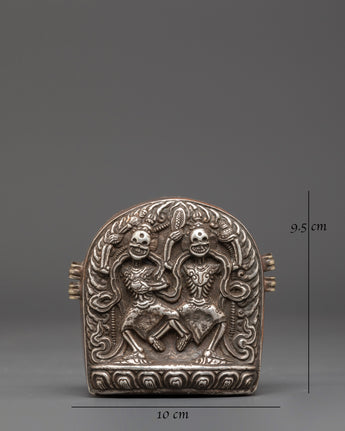 Embrace the sacred symbolism of the Skeleton Guardians Chitipati Ghau Box, a remarkable piece of Himalayan Buddhist artistry designed to inspire and protect. Standing 9.5cm tall and 10cm wide, this ritual amulet box is meticulously handcrafted using 975 silver repousse, highlighting the intricate details of the Chitipati skeleton deities. In Tibetan Buddhism, these guardians symbolize the impermanence of life and the victory over worldly illusions, offering a profound spiritual message. Beyond its striking beauty, this Ghau box serves as a potent protective amulet, making it an exceptional addition for those seeking both meaningful ritual connection and artistic elegance.