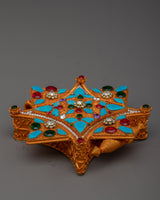 Introducing the Handcrafted Copper Ghau Storage Box, a remarkable creation handcrafted on a copper body with utmost care and precision. This exquisite box features a unique diamond shape, adding a touch of elegance to its design. The surface of the box is embellished with dazzling gemstones that are meticulously embedded, creating a stunning display of beauty and craftsmanship. To enhance its radiance, the box is further adorned with lavish 24k gold plating, adding a touch of opulence to this sacred piece. Use this Handcrafted Copper Ghau Storage Box to safely store and protect your precious spiritual artifacts, ensuring they are kept in a vessel as beautiful and meaningful as their purpose.