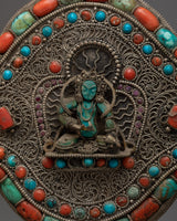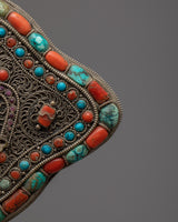 It is a striking piece of jewelry with a strong spiritual connection thanks to the original coral and turquoise inlay, which adds a splash of color and depth. A deity is created in the middle, signifying divine protection and direction.