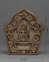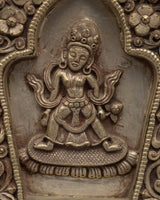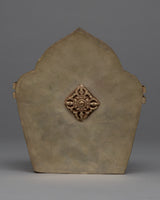 The Ghau is a handcrafted copper body with silver plating. The deity is carved on the box, which can be used in meditation and worship practices to invoke the blessings and guidance of Manjushri. The Outer part has a floral design in it.