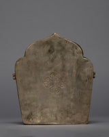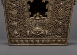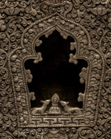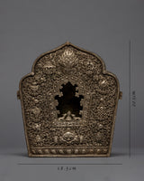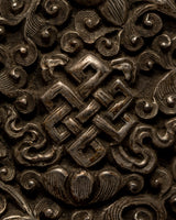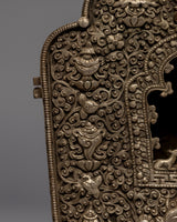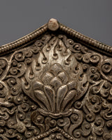 Our Ghau Prayer Box is beautifully carved with mystical Tibetan creatures and lucky symbols, such as Lotus Flowers, Tibetan Snow Lions, Clouds, and Conch Shells. It is made of copper with silver platings. It resembles a little container that may be used as a portable shrine or on your altar to keep and transport powerful, blessed objects.