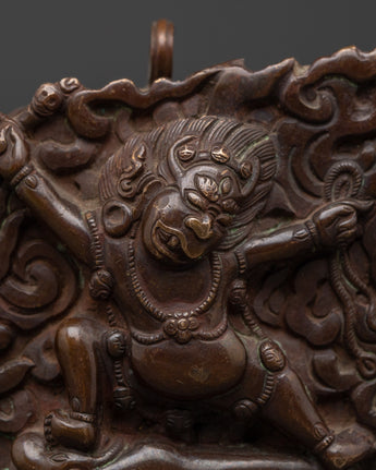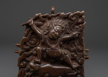 The wrathful deity carving showcases Yamantaka in his fierce manifestation as the destroyer of death and ignorance. The central figure displays multiple faces representing his omniscient awareness, with bulging eyes that pierce through illusion and a terrifying expression that frightens away hostile forces. Surrounded by a dynamic flame aureole symbolizing the burning away of obstacles and delusions, Yamantaka tramples upon figures representing conquered demons and ego. The ornate Buddhist art includes flowing cloud motifs, decorative scrollwork, and traditional Tibetan design elements that frame this powerful protector. Each carved detail in this portable altar tells part of the greater story of spiritual transformation and divine protection.