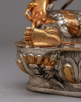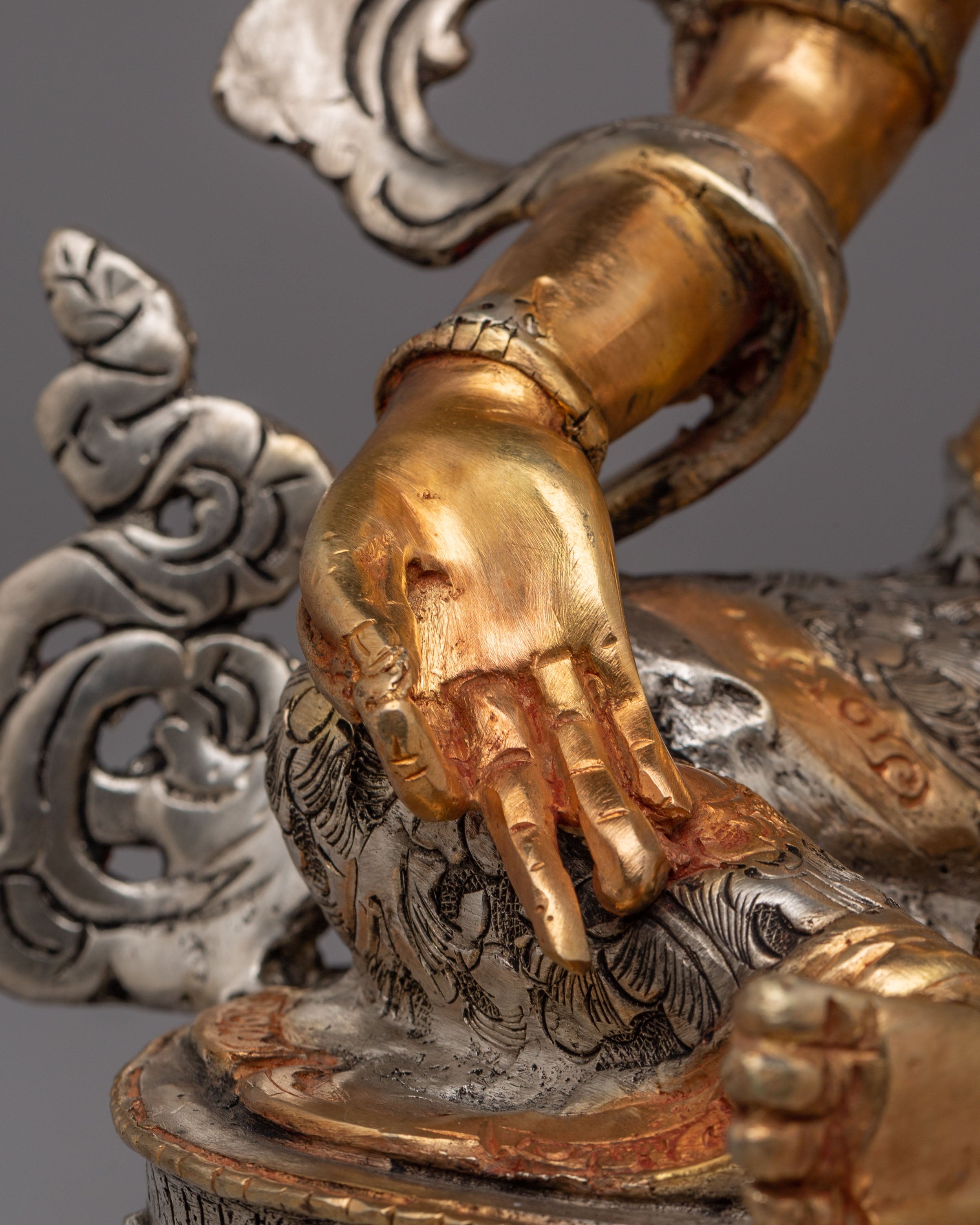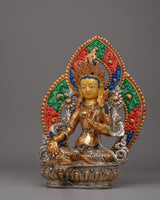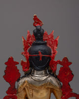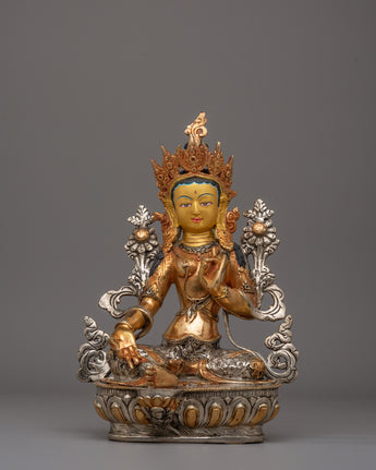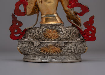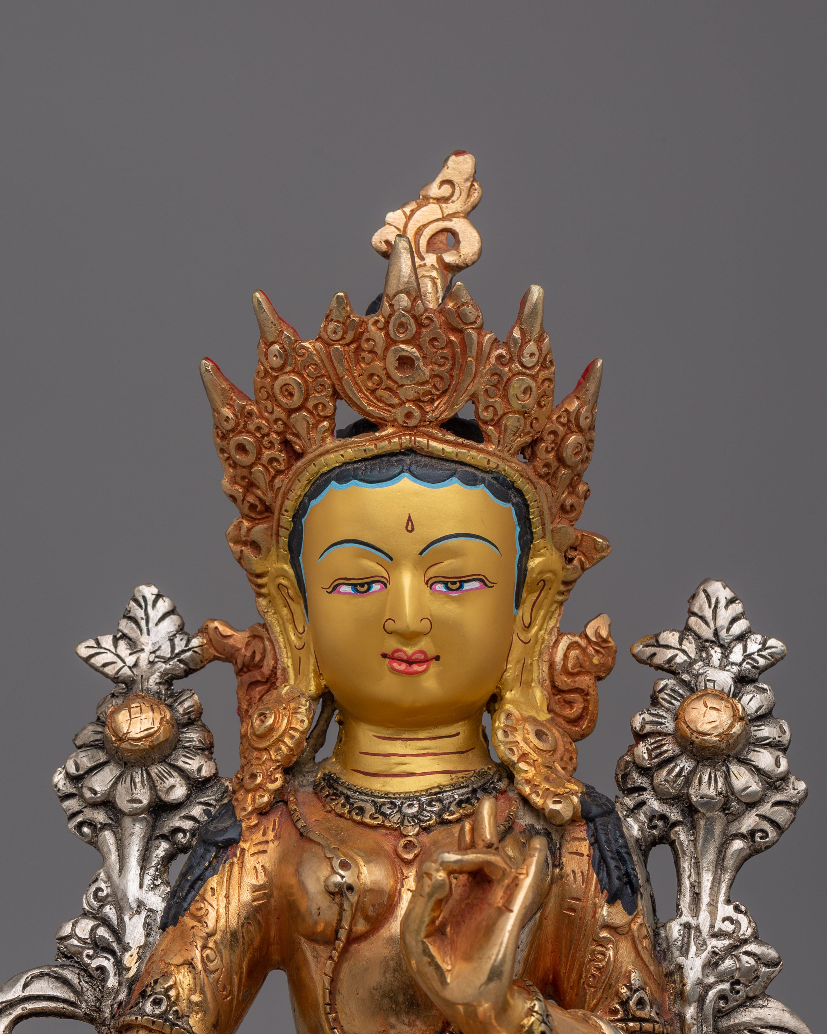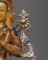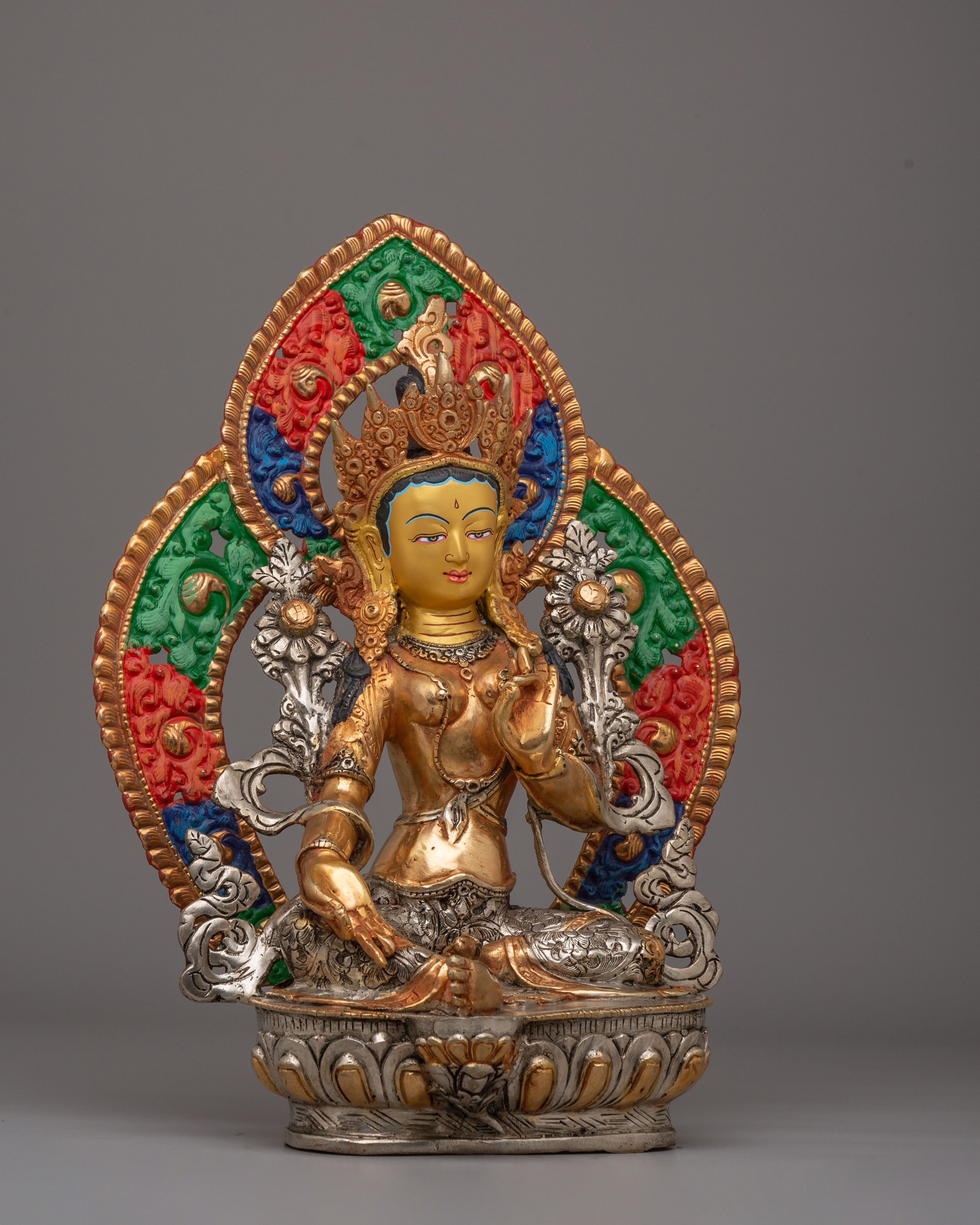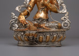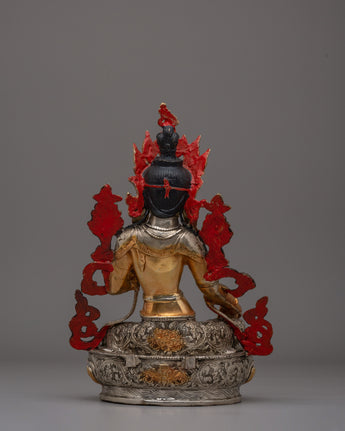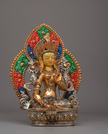 The Shyama Tara Statue of Love and Compassion embodies compassion and knowledge. This handcrafted statue is made of copper and plated with 24k gold, electro silver, and acrylic color. Standing 36 cm tall and 27 cm wide, it depicts Green Tara's serene and graceful form, symbolizing her loving and protective nature. The combination of copper, gold, and silver plating highlights the statue's intricate details, creating Tara's spiritual significance. This statue is perfect for meditation areas, altars, or as a decorative item, serving as a reminder of Tara's compassionate energy and love.