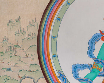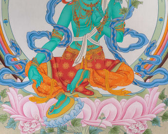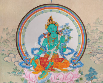 The Giclee Print of Green Tara Thangka, also known as Arya Tara, encapsulates the timeless essence of compassion, healing, and protection within Tibetan Buddhist tradition. Arya Tara, revered as the Mother of Liberation, is depicted in this exquisite print with resplendent grace and divine radiance. Her emerald-green form exudes a sense of serene strength and nurturing wisdom, while her compassionate gaze offers solace and guidance to all beings. In this Giclee rendition, every intricate detail of the original Thangka is faithfully preserved, from the delicate brushstrokes to the vibrant hues, ensuring a true-to-life representation of Arya Tara's sacred presence. As a symbol of enlightenment in female form, Arya Tara's depiction in Giclee print serves as a potent reminder of the innate potential for awakening and liberation within every individual. Displaying this artwork in sacred spaces invites the blessings of Arya Tara, fostering inner peace, spiritual growth, and the realization of one's highest aspirations.