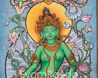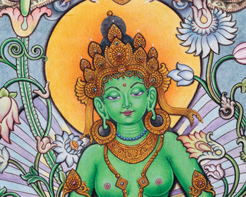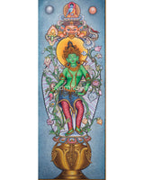 In Buddhist spirituality, none reigns more supreme than Green Tara Buddha - the female Buddha. Among the inhabitants of the Tibetan Himalayas, Tara is a venerated deity, revered as both the embodiment of compassion and the mother of emancipation. She is a stalwart protector and a constant beacon of grace, who we fervently strive to honor and receive her blessings in all aspects of our existence. Here in the thangka print, we have depicted the deity standing position on a lotus seat.