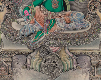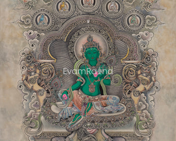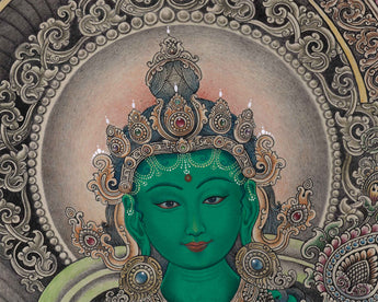 Embrace the radiant aura of Green Tara with our mesmerizing Green Tara Thangka Print. Imbued with profound symbolism, this exquisite artwork captures the essence of her compassionate and enlightened nature. Crafted using the Giclee technique on premium cotton matte canvas, the print vividly portrays the vibrant colors and intricate details of the original Thangka painting. Our Green Tara Thangka boasts intricate detailing that mesmerizes the eyes. From the vibrant colors that define her flowing robes to the ornate patterns adorning the background, every element is meticulously rendered, capturing the essence of Green Tara's divine presence. Immerse yourself in the transformative power of Green Tara with our enchanting Thangka Print. Embrace her compassionate energy and invite a sense of tranquility and spiritual growth into your meditation practice.