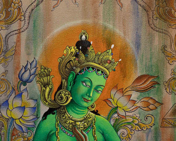 The Green Tara Thangka Print captures the essence of the revered goddess Green Tara, an embodiment of compassion, protection, and enlightened wisdom. In this mesmerizing artwork, Green Tara is depicted with her radiant emerald complexion, gracefully seated on a lotus throne, and adorned with symbols of her divine attributes. The print emanates a sense of serene beauty and inner strength, inviting viewers to connect with the transformative power of Tara's presence. As you immerse yourself in the intricate details and vibrant colors of this thangka print, you are enveloped by a profound sense of nurturance and guidance. Green Tara's compassionate energy and watchful gaze offer solace and protection, while her wisdom empowers you to overcome obstacles and embrace the path of enlightenment. May this Green Tara Thangka Print serve as a reminder of the boundless compassion and inner potential within each of us, inspiring you to cultivate love, healing, and liberation in your life's journey.