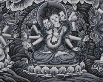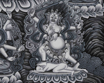 Introducing our Green Tara Digital Print, a high-quality giclée print on cotton canvas, designed to capture the sacred essence of the Goddess of Compassion in a visually striking and spiritually soothing format. The monochromatic edition features Green Tara seated on a lotus throne, adorned with intricate sacred symbols such as the Vajra, Dharma Wheel, and Double Vajra, symbolizing strength, wisdom, and the indestructible nature of the enlightened mind.