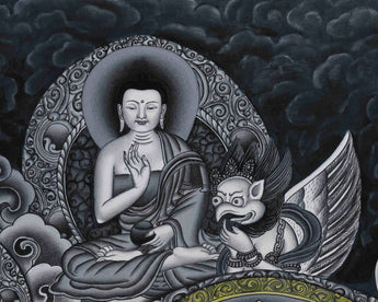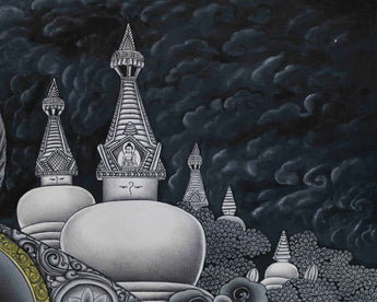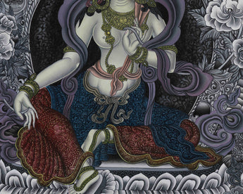 The print also includes subtle yet profound iconographic elements, such as the Five Dhyani Buddhas representing awakened consciousness, a row of stupas reinforcing the spiritual sanctity, and a gathering of protector deities underscoring Tara's role as a guardian and liberator of beings from suffering. Printed with archival-quality inks and advanced giclée technology, the print offers sharp detail, smooth gradations, and longevity.