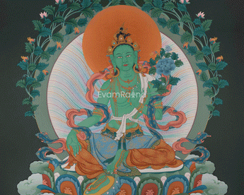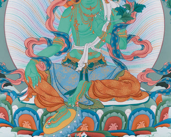 Embodying divine grace and swift compassion, this Goddess Green Tara Print is a high-quality giclee canvas reproduction that captures the richness of traditional thangka artistry. Known as the Mother of Liberation, Green Tara is revered for her immediate protection and boundless compassion. She is depicted seated on a lotus throne, surrounded by blooming flowers that highlight her nurturing presence. With her right leg extended, she shows her readiness to step forward and help all beings, while her left leg is folded in meditation, which signifies inner balance and wisdom. She gently holds a blue lotus (utpala), symbolizing purity and enlightenment, while her right hand extends outward in the gesture of blessing and protection.