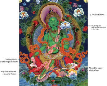 This Tibetan Thangka Green Tara print is of the most well-known deity in the Buddhist community Tara, a female Buddha. Within the Tibetan Himalayan population, Tara is a widely practiced deity. In this particular piece, the deity is regally seated on a moon disc upon a lotus seat in a royal ease posture, ready for any action. She portrays a 'Varada mudra,' or the granting mudra bestowing generosity. Her right hand holds a blue Utpala and exudes a peaceful expression. She is adorned with various jewels and wears a 5 jeweled crown.
