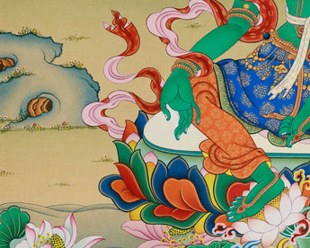 Bring spiritual elegance to your space with our Green Tara Divine Tapestry Thangka Print. This beautifully detailed print depicts the goddess Green Tara, known for her compassion and swift action. Hang it in your home or office for a reminder of her calming presence and guidance.