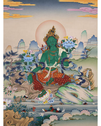 The Green Tara Guru thangka print is composed of magnificent colors portraying a serene landscape with Mother in the center. The divine figure is rendered in a vibrant shade of green, perched elegantly with her left foot bent and her right foot pendant cradled by a white lotus. Precious gems lie beneath her feet while she holds a bouquet of lotus flowers - in varying stages of bloom - in each hand. The warmth of her gaze is matched by the harmony of the green hills and cascading waterfall, which flow from the snow-white peaks in the distance.
